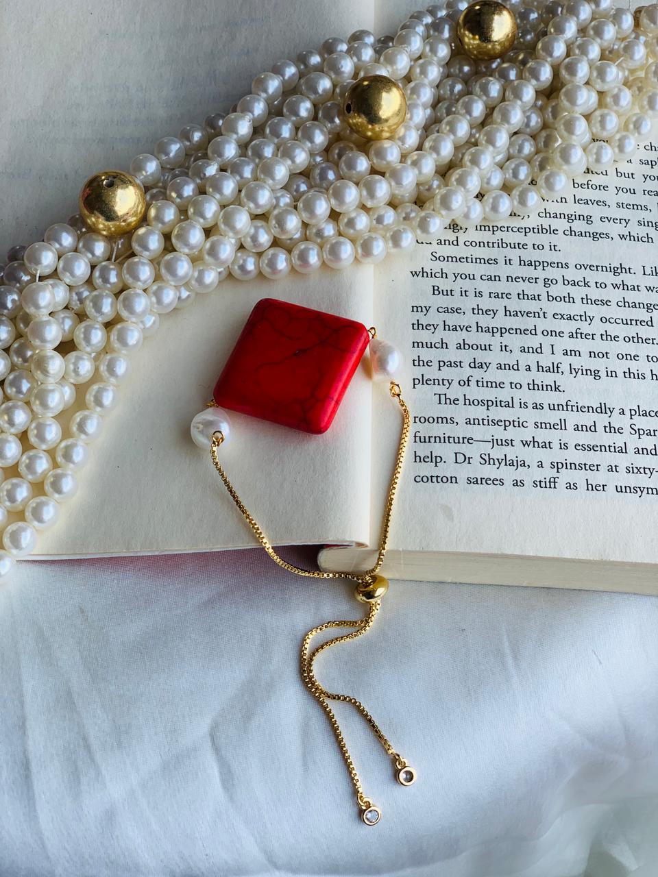 Coloured Stone Bracelet with pearl In Adjustable chain